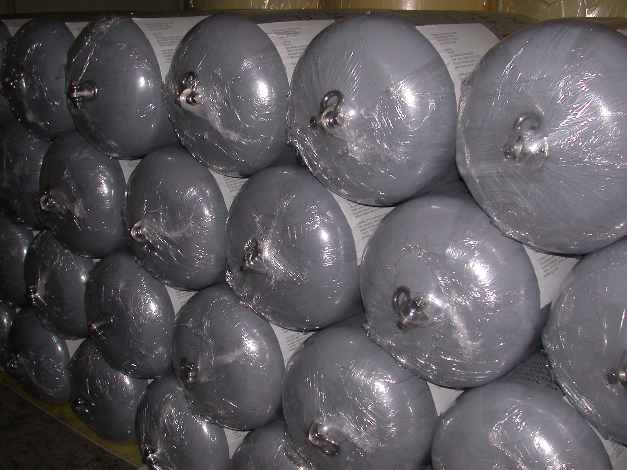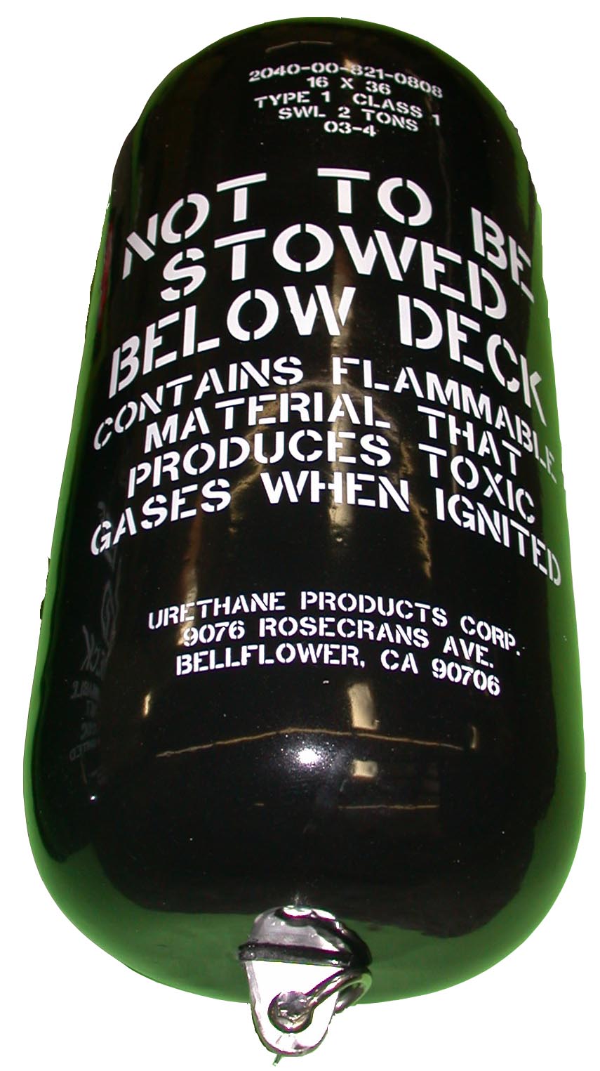 Urethane Products' smallest fenders have an optional internal chain to connect the padeye end fittings, greatly improving the pull through strength of the fenders. The three most common sizes are: 16" x 36"; 24" x 36"; and 32" x 50". Custom sizes are also available.